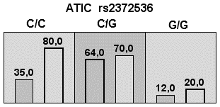 ATIC rs2372536 + SLC19A1 rs1051266 | 65,8 [56,6; 74,1] 55,3 [47,8; 62,6] 60,5 | 2,38 [1,45; 3,90] | χ2(1)=11,96 р <0,001 | 6 /10 |