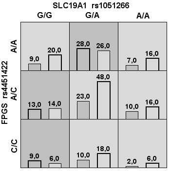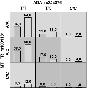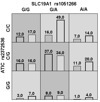 SLC19A1 rs1051266 | ADA rs244076 | ATIC rs2372536 | MTHFR rs1801131 | MTHFR rs1801133 | Риск = |