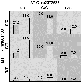 ATIC rs2372536 + MTHFR rs1801133 | 59,5 [50,2; 68,3] 59,4 [51,9; 66,6] 59,4 | 2,15 [1,32; 3,49] | χ2(1)=9,58 р=0,002 | 10 /10 |