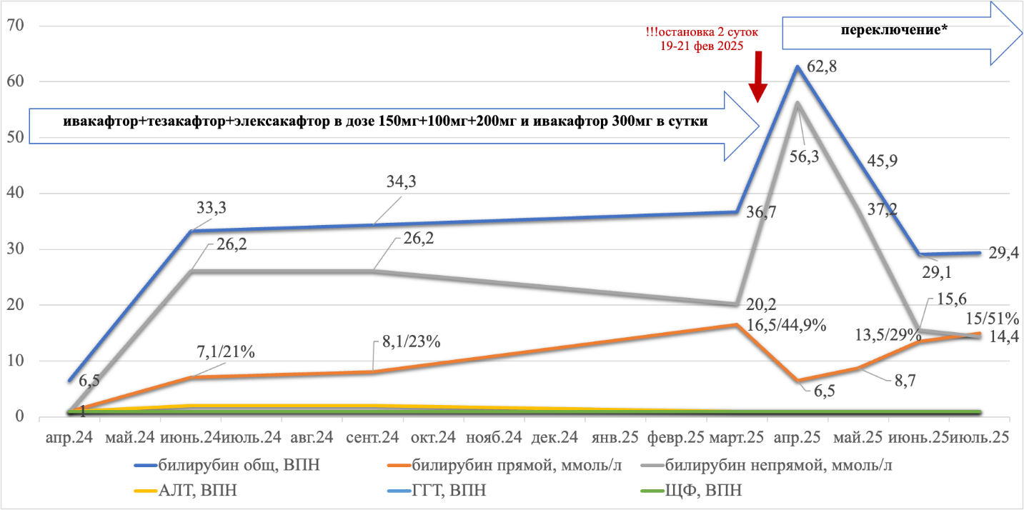 Через 12 месяцев применения таргетного препарата ивакафтор + тезакафтор + элексакафтор + ивакафтор была остановка в лечении по инициативе законного представителя с 19 по 21 февраля 2025 г., к сожалению, в этот период и в последующем после возобновления терапии получено 4-х кратное повышение уровня общего билирубина за счёт роста в структуре доли прямого билирубина до 45 %. В последующем получено 2-х кратное снижение уровня общего билирубина, уровень прямого билирубина со снижением с 56,3 ммоль/л до 15 ммоль/л, наблюдение и оценка продолжаются в настоящее время. Клинических проявлений выявленные ранее отклонения в биохимических тестах не имели.