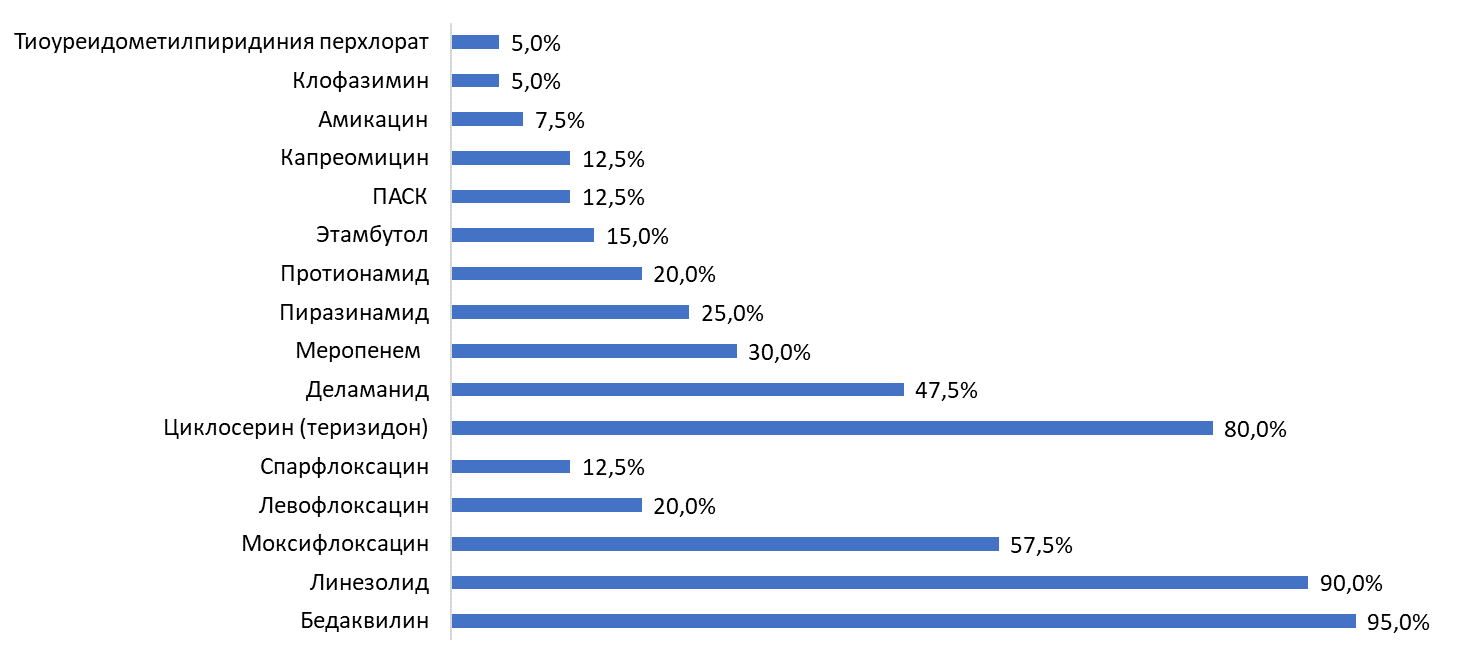 Режим химиотерапии формировали согласно актуальной версии клинических рекомендаций («Туберкулёз у взрослых» [15]) с учётом индивидуального спектра лекарственной чувствительности возбудителя, анамнестических данных о переносимости терапии, спектра и тяжести сопутствующей патологии; все пациенты в составе схемы лечения получали бедаквилин, линезолид и фторхинолоны (моксифлоксацин, или левофлоксацин, или спарфлоксацин), а также другие препараты, рекомендуемые в составе режима (циклосерин или теризидон, деламанид, протионамид, ПАСК, амикацин или капреомицин, карбапенемы). Спектр назначаемых ПТП представлен на рис. 1.
