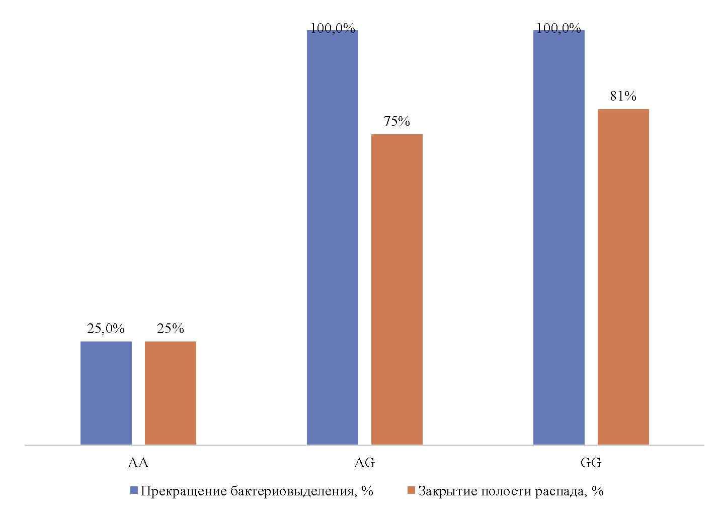 Ни у одного из пациентов, имеющих гомозиготную мутацию гена ABCG2 (rs2231142, генотип АА), не было достигнуто прекращение бактериовыделения в стандартные сроки интенсивной фазы химиотерапии (у одной пациентки бактериовыделение прекратилось после 9 месяцев лечения), в то время как у больных с генотипами AG и GG успешный исход лечения по микробиологическому критерию достигнут в 100 % случаев, р <0,01, ОШ=0,083 (95%ДИ 0,01-0,98). Генотип АА гена ABCG2 rs2231142 был также связан с низкой частотой закрытия полости распада: 25 против 75 % у пациентов с генотипами AG и GG, р <0,01, ОШ=0,083, 95%ДИ 0,01-0,98 (см. рис. 3).