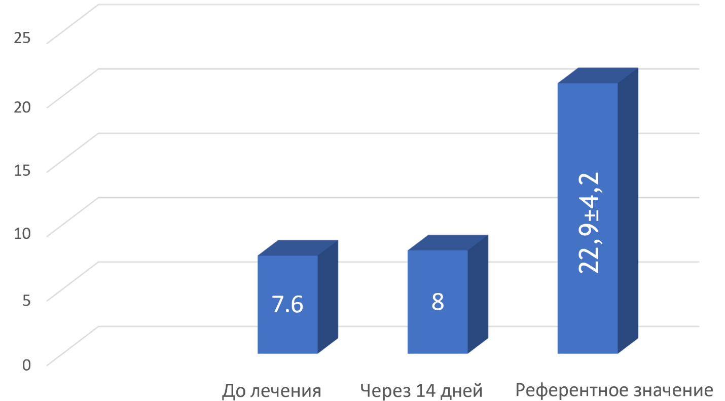 Через 2 недели от начала терапии пропранололом при контрольном ультрасонографическом измерении средней линейной скорости кровотока воротной вены определено её незначительное увеличение до 8,0 см/с, то есть на 0,6 см/с или 8,1 % при сравнении с исходной СЛСКВ (рис. 1).