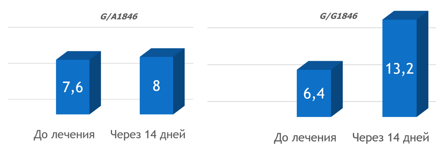 Пациент Г. (генотип G/G, нормальный функциональный аллель): на той же дозе препарата скорость кровотока увеличилась значительно — на 106,2%, что говорит о высокой эффективности.